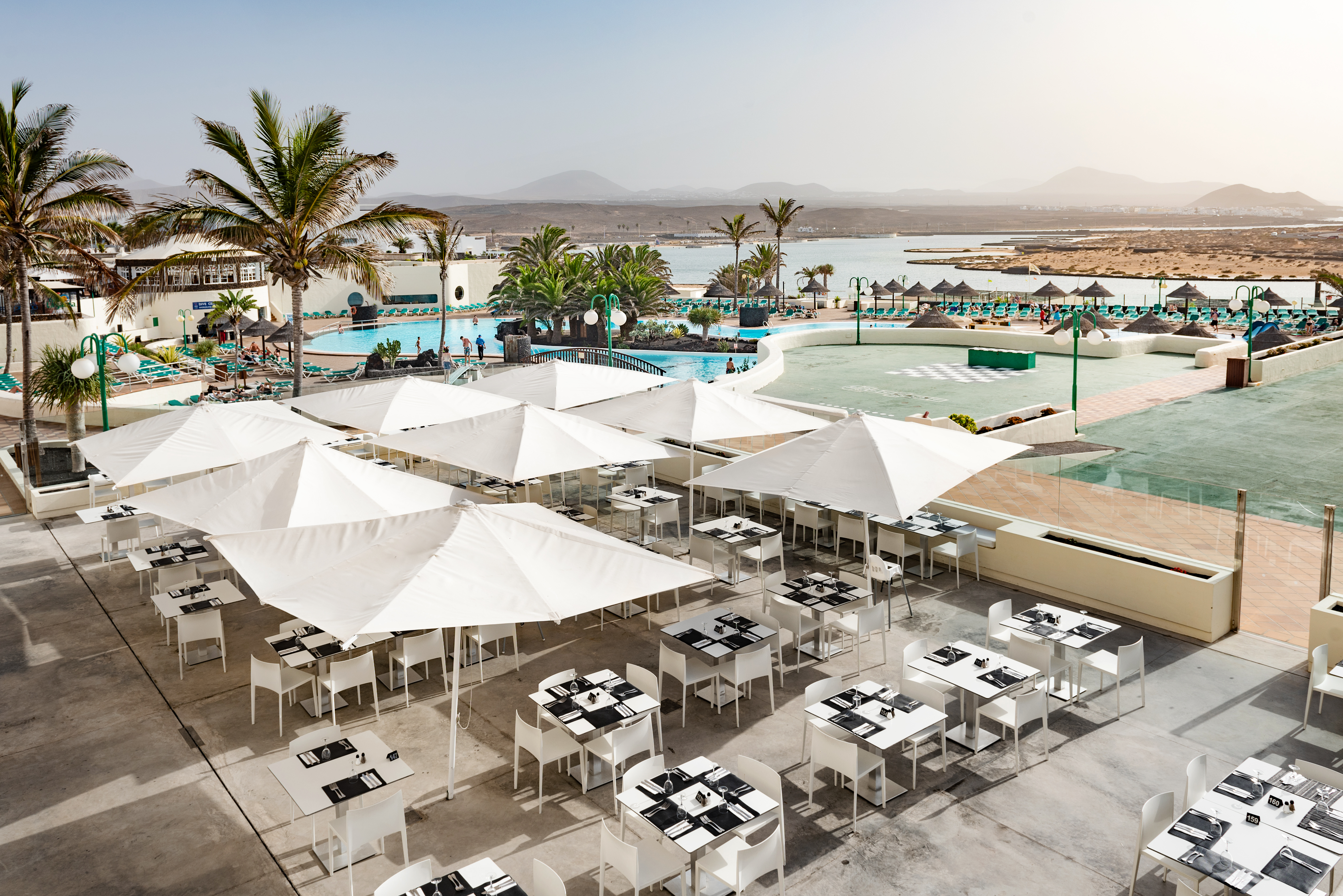 Enjoy your meals in our relaxed indoor space or take in the beautiful views of the sea and the leisure pool on our outdoor terrace.